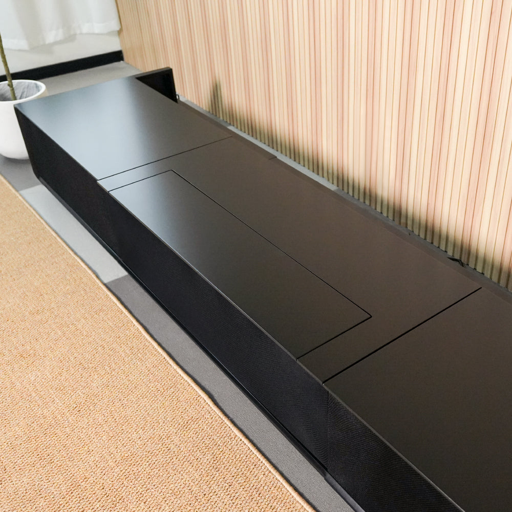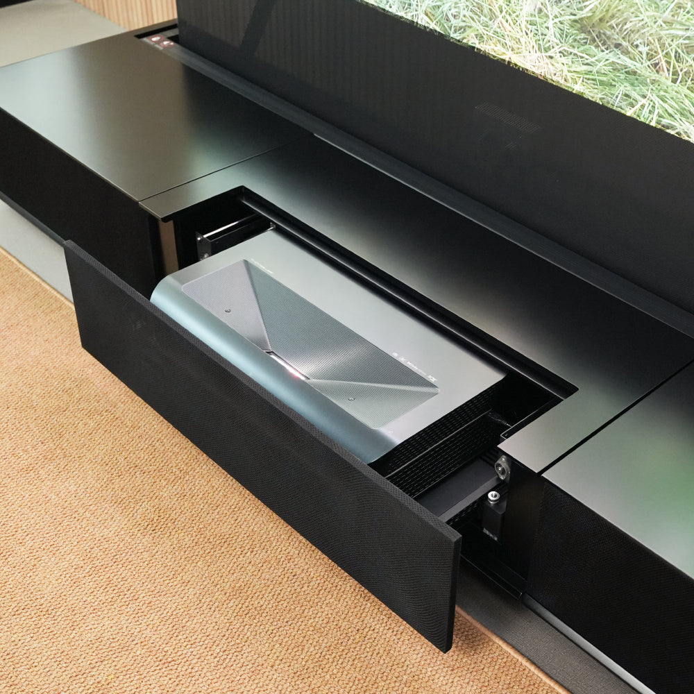 Le meuble Home Cinéma Shore incarne la solution intégrée ultime : il dissimule élégamment un projecteur UCF et un écran CLR motorisé géant (jusqu'à 3,05 m) dans un design sobre, offrant une image au contraste exceptionnel grâce à la technologie de réjection de lumière parasite, même en ambiance lumineuse. Son automatisation ingénieuse synchronise d'une simple touche l'ouverture du tiroir, l'allumage du projecteur et le déploiement parfait de l'écran, avant d'opérer sa disparition magique en 30 secondes après la séance, ne laissant qu'un discret meuble bas décoratif.