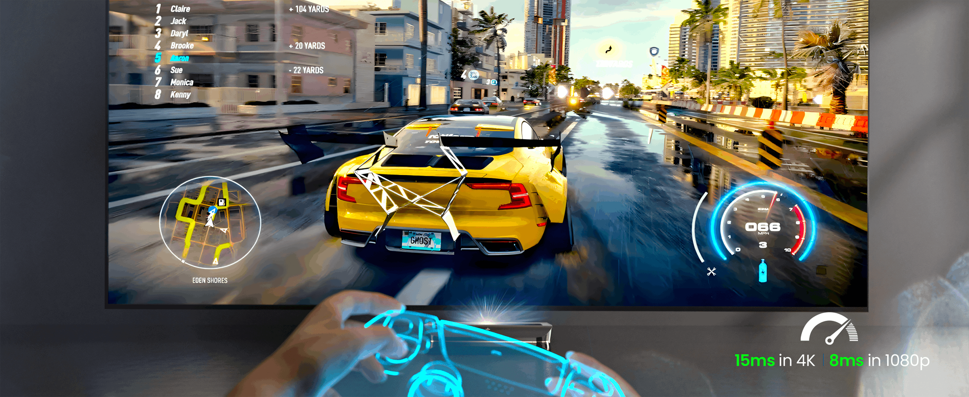 Atraso de Entrada: 15ms 4K@60Hz, 8ms 1080p@120Hz no Modo Turbo